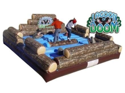 Beware of the gators and piranha! They e hungry and are going to get you if you fall off Inflatable 2000’s, brand new LAGOON OF DOOM. Test your agility and endurance when you climb on the foam log, making it spin on its axle. Attempt to keep your balance as your opponent tries spinning faster, attempting to spin you off. Meanwhile, the lagoon creatures are nipping at your heels trying to make a meal of you. Will your partner take the plunge before you do?
