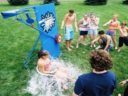 Play indoors or out. Your "victim" sits under the water balloon basket. Participants throw their balls at the target. When the target is hit the water balloon breaks and showers the "victim" with water. We bring an inflatable pool for indoor use.