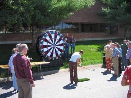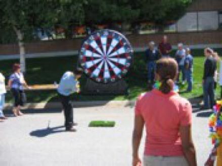 Our 2 in 1 Bulls Eye is a giant Velcro sensitive dart board. Stand the 2 in 1 Bulls Eye upright and try to hit the bulls eye with our giant darts. Lay the 2 in 1 Bulls Eye down at an angle and see just how good your golf chipping is. The 2 in 1 Bulls Eye is a great addition to any event!