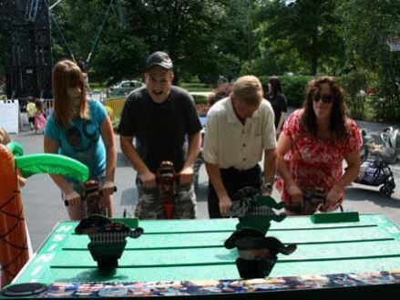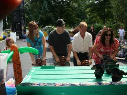 The horses are at the gate. The faster the four players gallop on their hobby horse, the faster their horse runs on the track! At the end of the race the winning lane will light up, and the commentary will announce the winner! Interactive Horse Racing is a hilarious and competitive event!